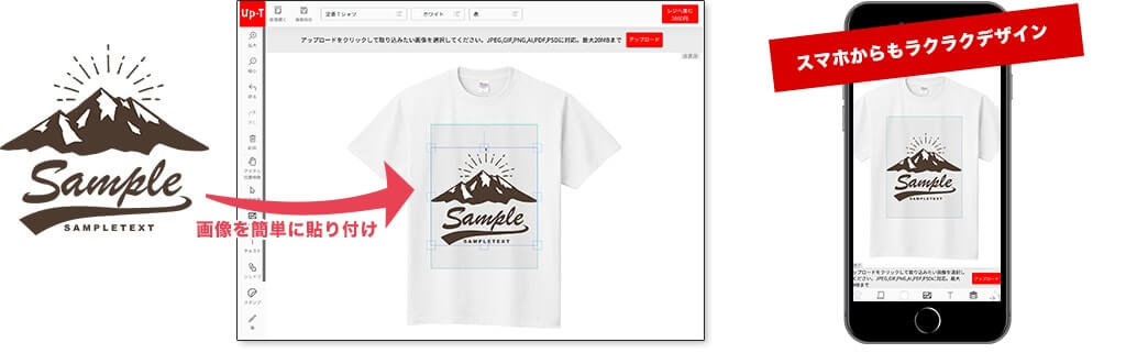 画像をアップロードして乗せるだけ。しかも、png、jpeg、Ai、GIFなど様々な画像が使えます。カメラで撮ってすぐアップロードなんてことも可能です。